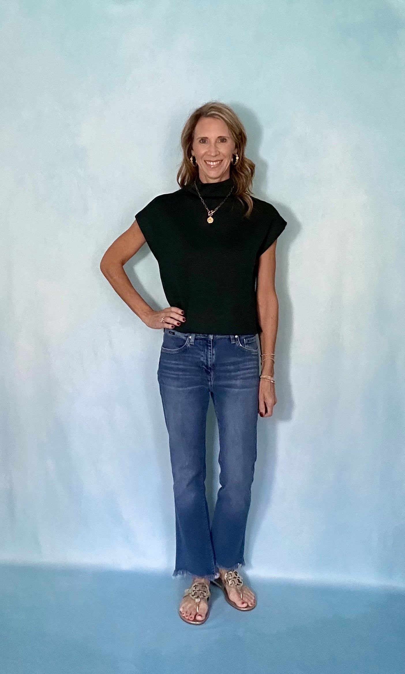 This is a sleeveless top with a high mock-neck collar and a relaxed, draped fit. It comes in two color variations: Chocolate brown and hunter green.
