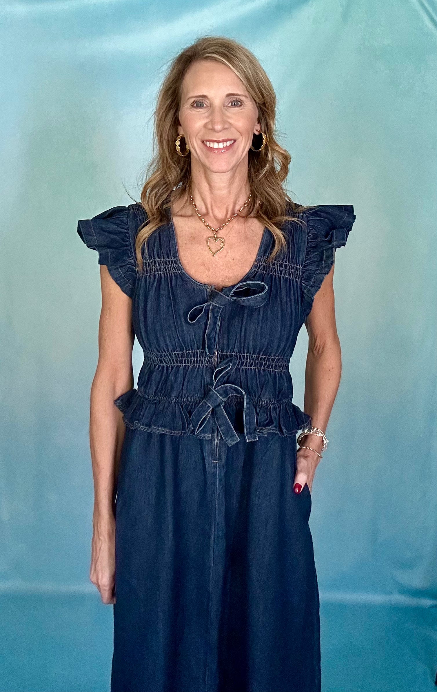 Introducing the Boho Chic Denim Dress, a perfect blend of comfort and style. The delicate ruffles on the shoulders and a stylish smocked bodice add a touch of western flair, while the flowy maxi skirt and functional pockets offer practicality without sacrificing elegance. It’s an ideal dress for those who want a look that is both casual and chic.