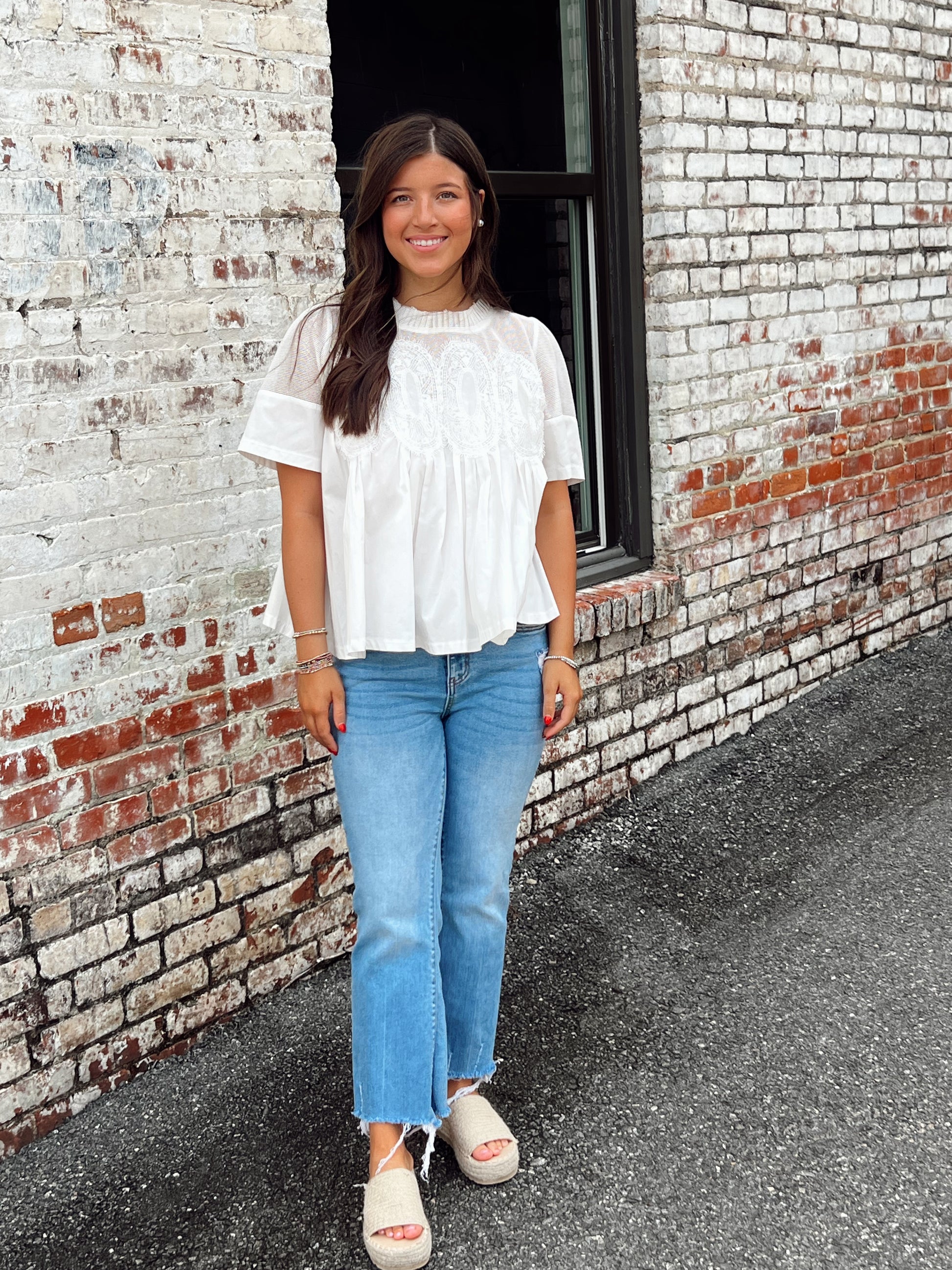This shirt is a white babydoll-style top featuring a voluminous peplum hem and delicate lace/mesh yoke and shoulder details. The Eliza top is a sweet and breezy option ideal for a casual summer day or a picnic. Wear it with distressed denim shorts or light-wash jeans, and complete the charming, feminine outfit by adding layered necklaces and espadrille flats.