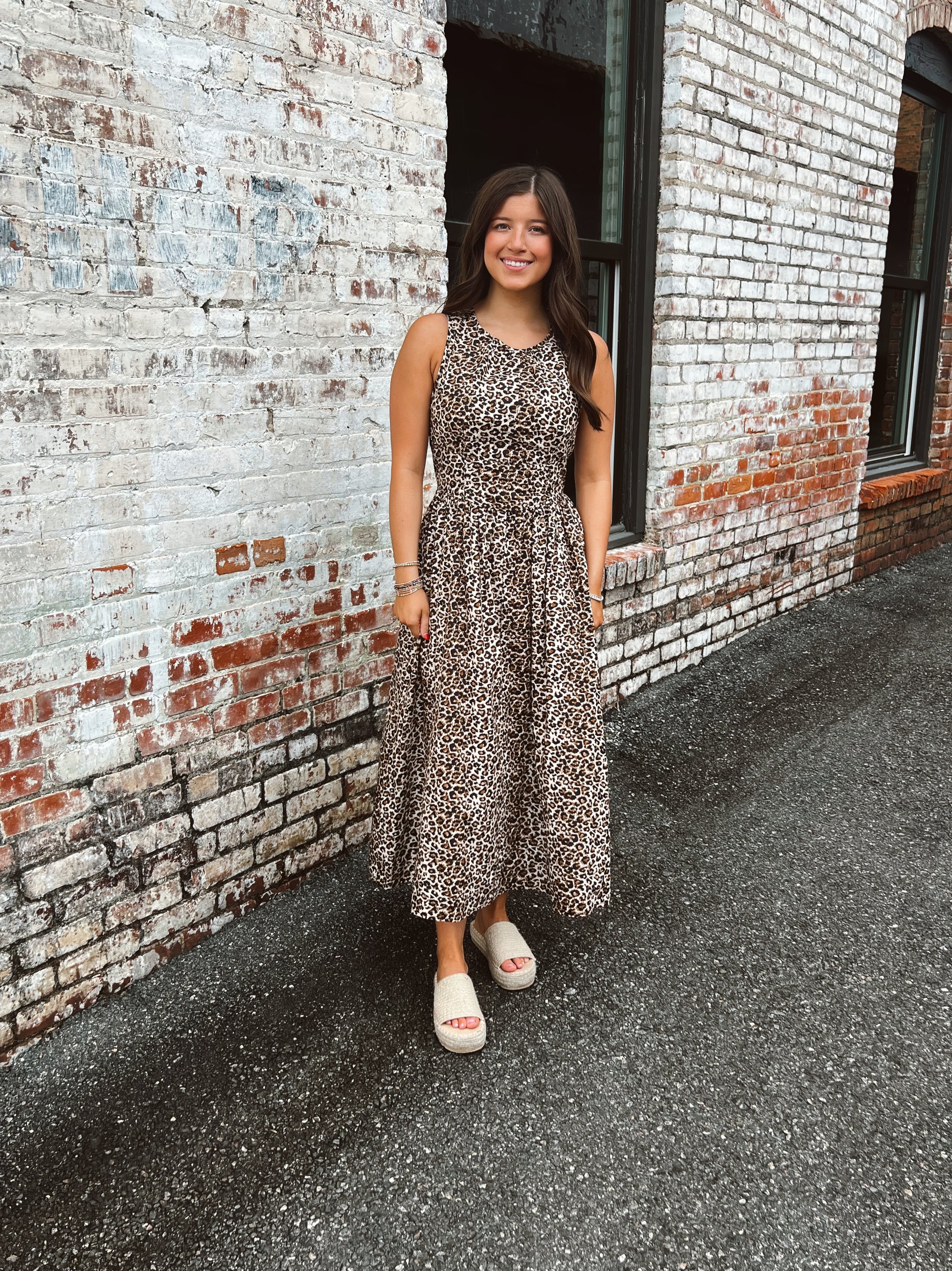 This dress is a sleeveless, midi-length dress featuring an all-over leopard print that is both chic and timeless, with a flattering, cinched waist. The Gemma dress is an ideal piece for a baby or wedding shower, a date night, or a fall festival. Layer it with a denim jacket and boots for cooler weather, or keep it light and airy with espadrille wedges and simple gold jewelry for a warm-weather occasion.
