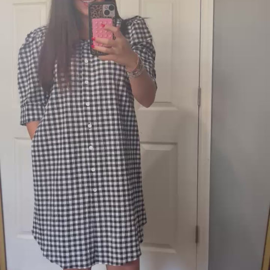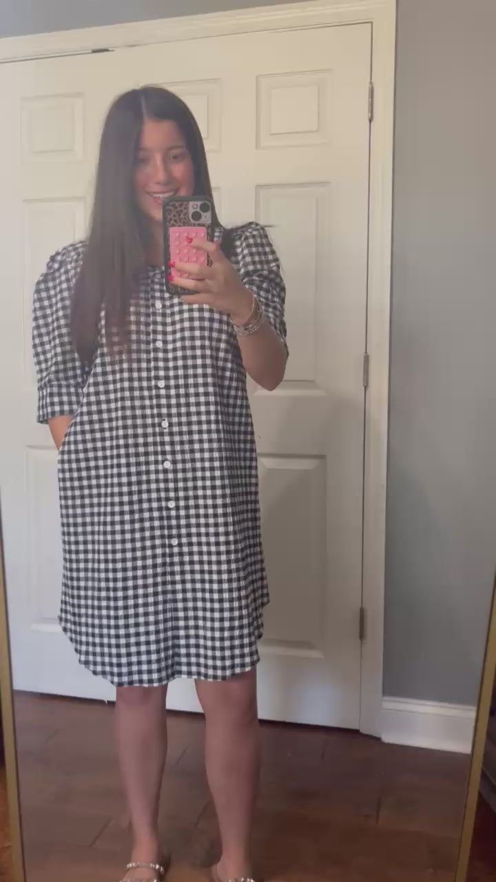 This black and white checked shirt dress is a great addition to your wardrobe. From wearing it for gameday festivities, brunch with the girls, or as a fall transition piece, this dress is a must have! Dress is button front and has pockets.