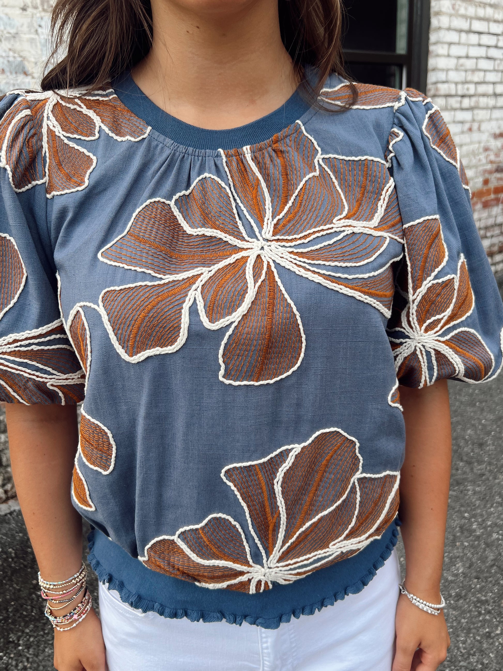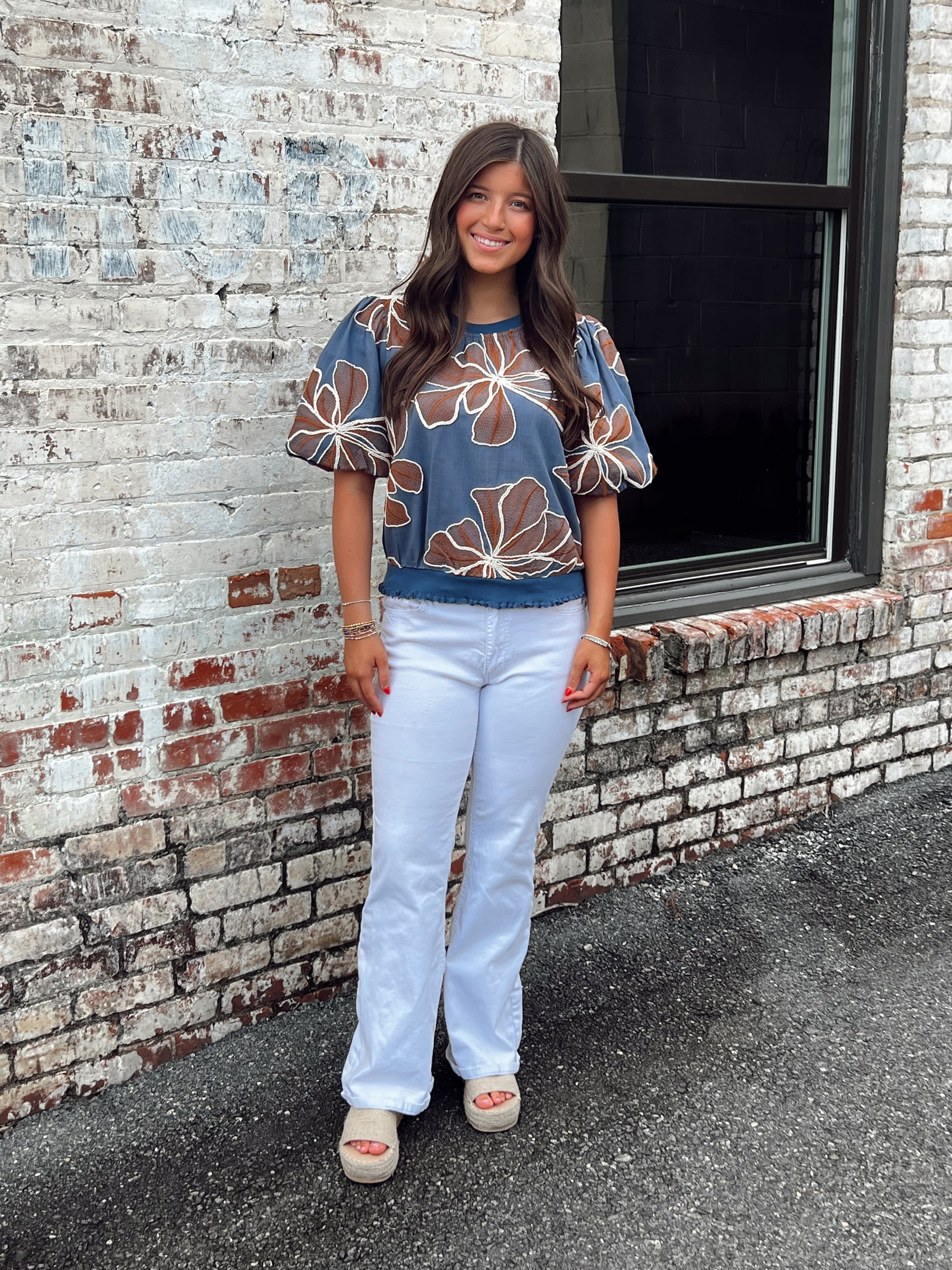 This shirt is a navy blue top with brown and cream floral patterns and fashionable puff sleeves. The Fae top is perfect for a weekend brunch or a casual dinner out. Pair it with crisp white flare jeans for a clean, stylish look, or tuck it into a pair of tailored shorts for a summer event. You can easily complete this charming vibe by adding wedges or platform sandals.