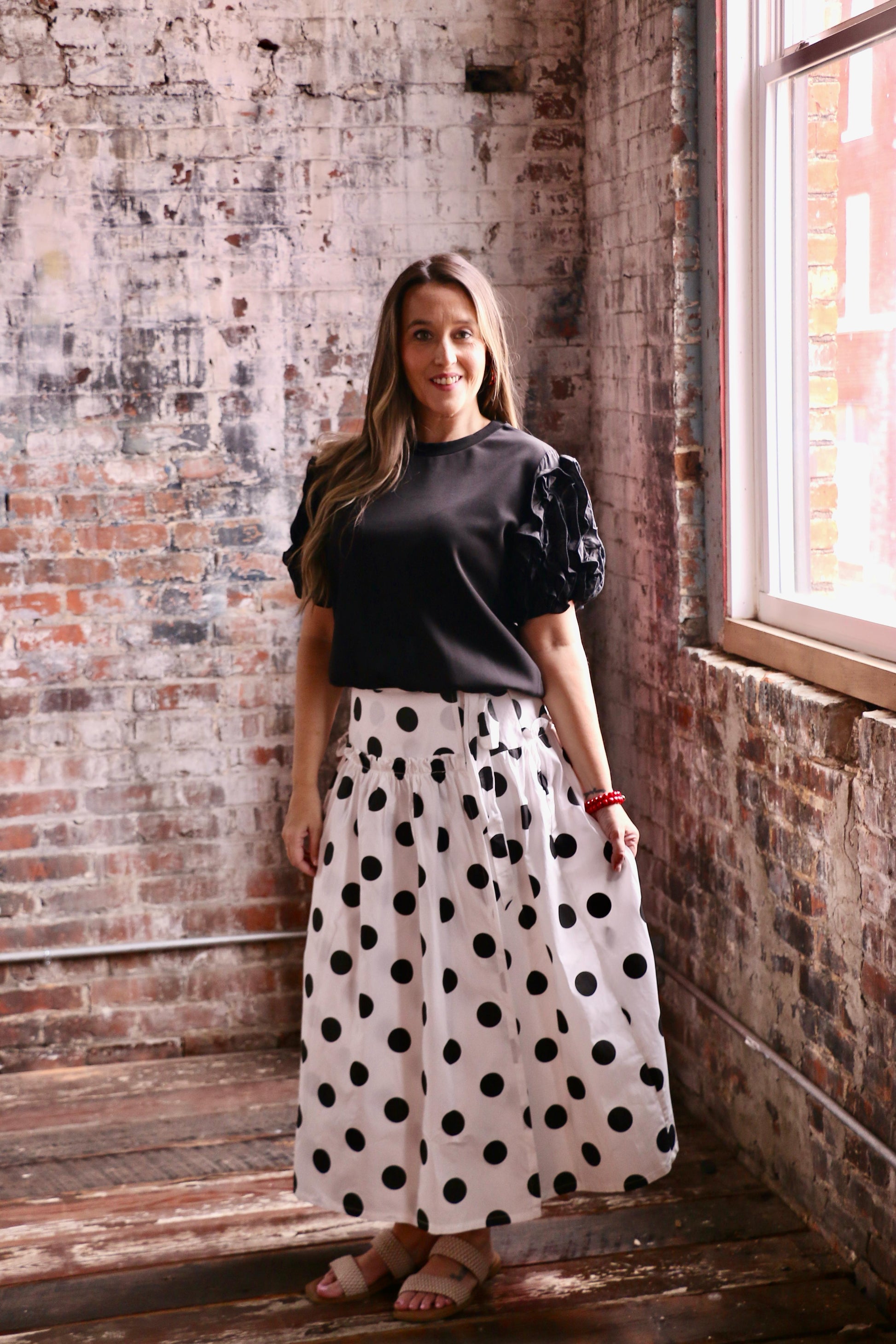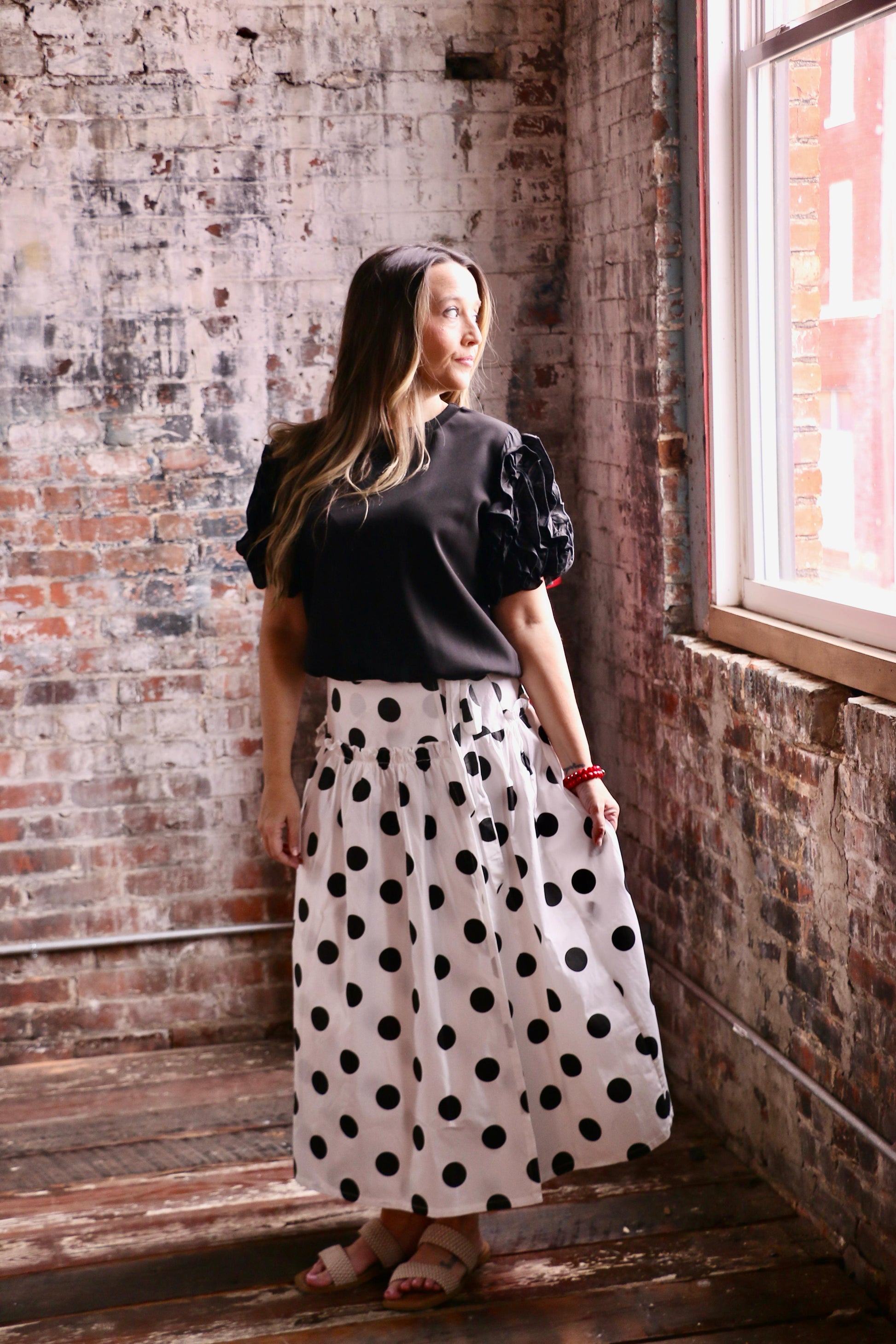 This garment is a structured black top featuring a graceful high mock neck and statement voluminous ruffled short puff sleeves. The clean, solid fabric is designed to be the versatile anchor of any high-contrast outfit. Pair this piece with bold, patterned bottoms like the polka dot skirt shown for a fun, retro-inspired party look, or tuck it into white trousers for a striking monochrome office ensemble. Ideal for a cocktail reception, an upscale brunch, or a holiday gathering.