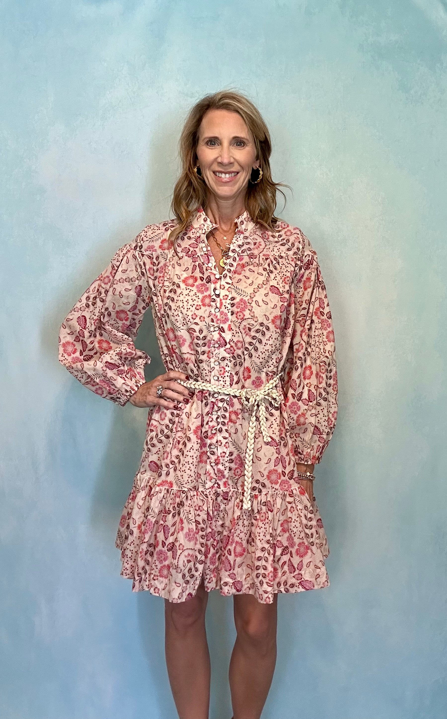 This is a floral dress with a pink and cream pattern. It features a ruffled collar and a button-down front. The long, voluminous sleeves are gathered at the cuffs, and the dress is cinched at the waist with a braided cream-colored belt. The skirt has a tiered, ruffled hem.