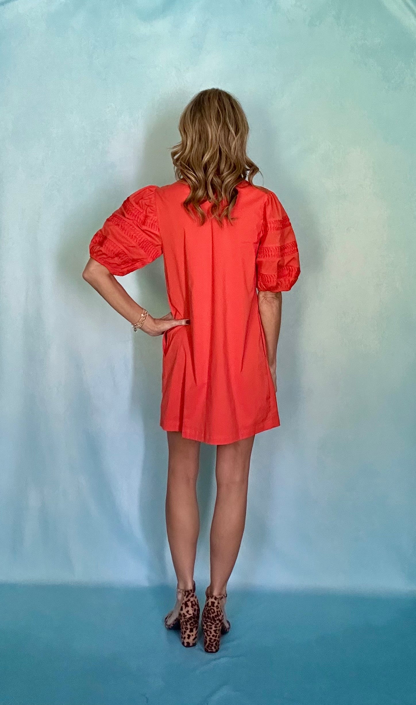 This vibrant orange mini-dress has a loose, relaxed fit. The dress has a round neckline with gathered detailing and features voluminous, elbow-length puff sleeves with intricate detailed patterns.