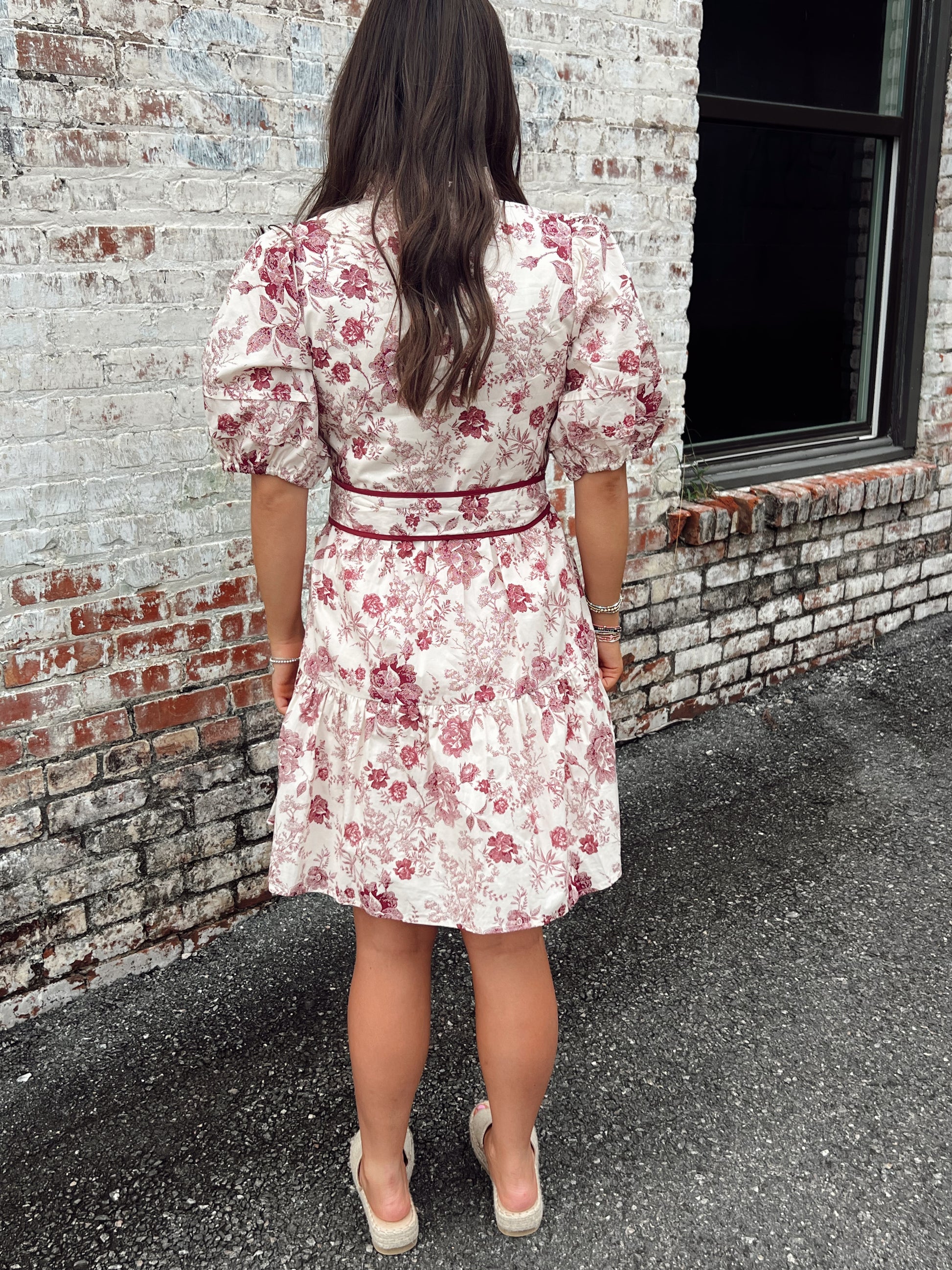 This dress is a short, puff-sleeve dress in a beautiful cream and deep red vintage-inspired floral print. It's elegantly finished with a velvet ribbon waist tie for a touch of luxury. The Victoria dress is perfect for a sophisticated fall cocktail hour, a holiday party, or an engagement celebration. For accessories, pair it with nude heels and delicate jewelry, or make a more dramatic statement with knee-high suede boots.